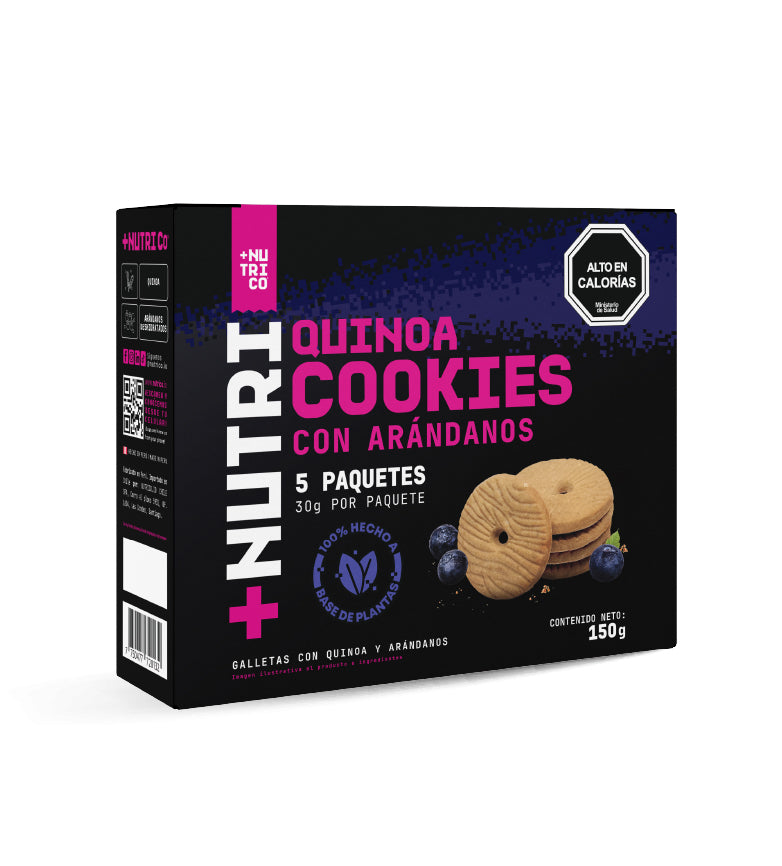 Harina de trigo fortificada, azúcar rubia, agua, arándanos deshidratados, hojuelas de quinoa y estevia.